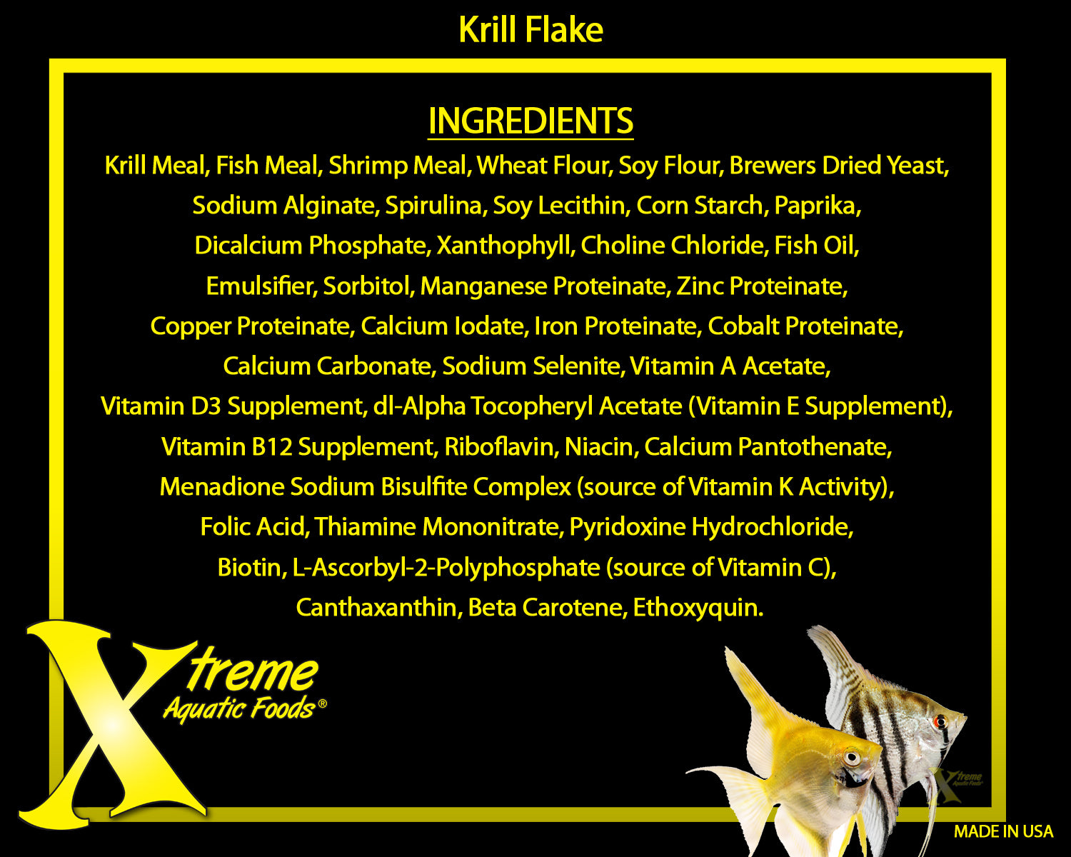 Krill Meal, Fish Meal, Shrimp Meal, Wheat Flour Soy Flour, Brewers Dried Yeast, Sodium Alginate, Sprirulina, Soy Lecithin, Corn Starch, Paprika, Dicalcium Phosphate, Xanthophyll, Choline Chloride, Fish Oil, Emulsifier, Sorbitol, Red 3, Manganese Proteinate, Zinc Proteinate, coper Proteinate, Calcium Iodate, Iron Proteinate, Cobalt Proteinate, Calcium Carbonate, Sodium Selenite, Vitamin A Acetate, Vitamin D3 Supplement, dl-Alpha Tocopheryl Acetate (Vitamin E Supplement), Vitamin B12 Supplement, Riboflavin, Niacin, Calcium Pantothenate, Menadione Sodium Bisulfite Complex (source of Vitamin K Activity), Folic Acid, Thiamine Mononitrate, Pyridoxine Hydrochloride, Biotin, L-Ascorbyl-2- Polyphosphate (source of Vitamin C), Canthaxanthin, Beta Carotene, Ethoxyquin, TBHQ (preservative).