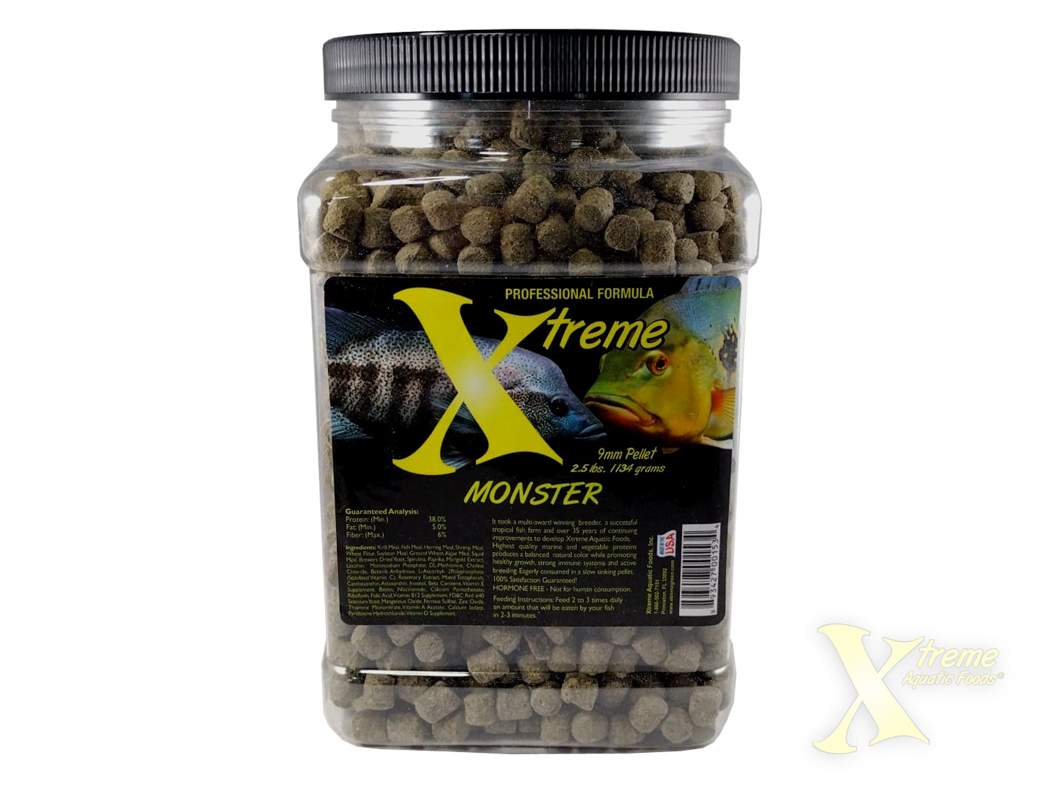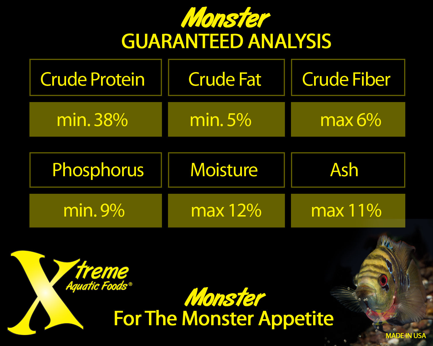 Description: Monster was originally formulated for monster fish. Large oscars, pike cichlids, arowanas, green terror, peacock bass, jaguar cichlids, bichars and many others. This large pellet used sustainable marine proteins from Squid, Fish and Shrimp and Spirulina and Wheat Middlings to provide a balanced diet for these hardy eaters. And...