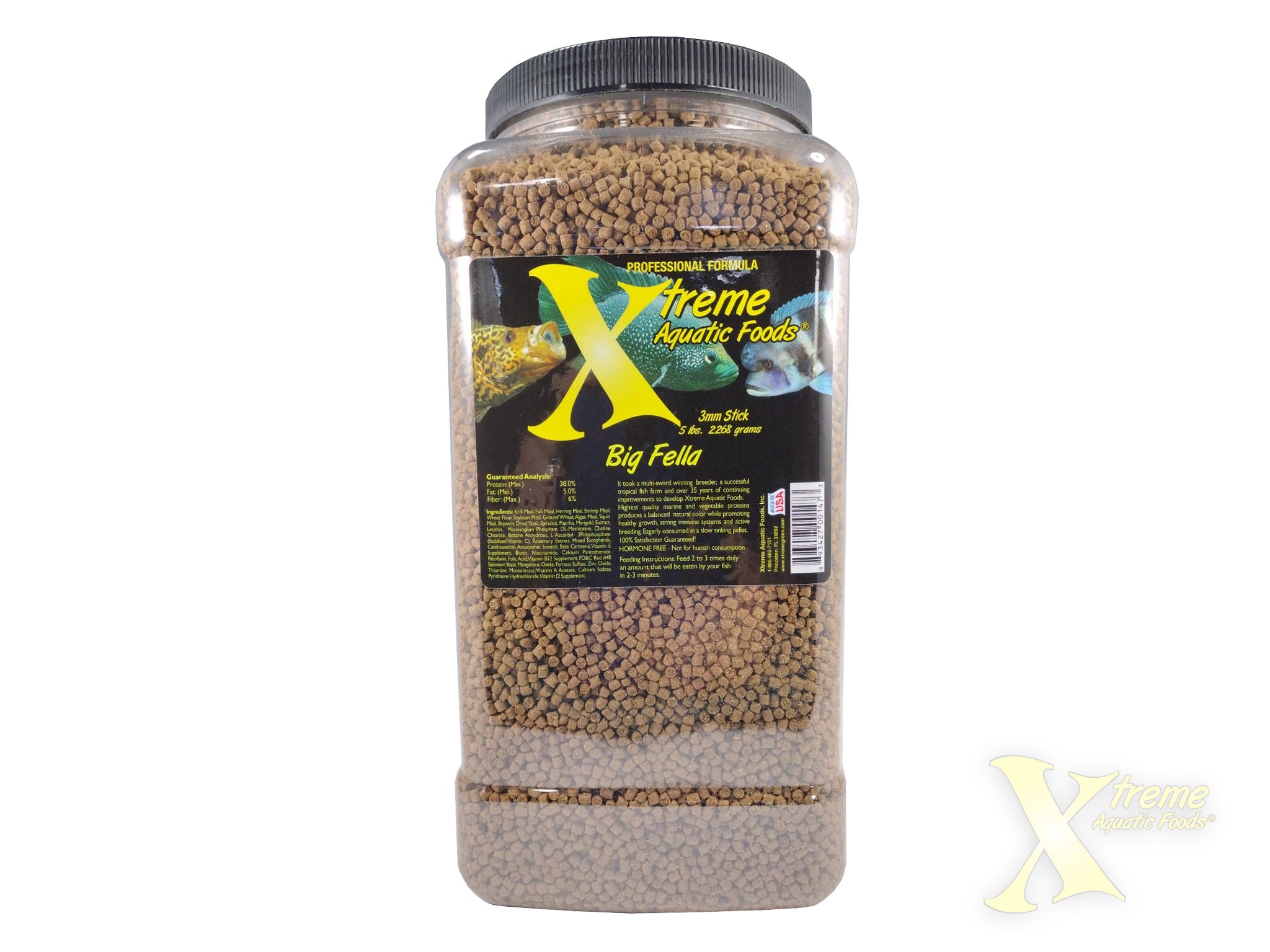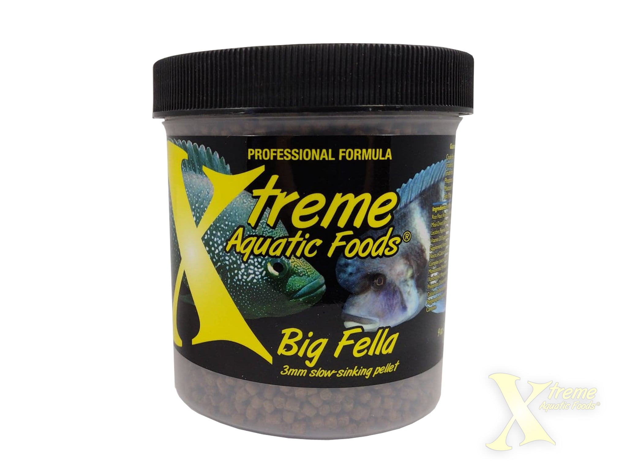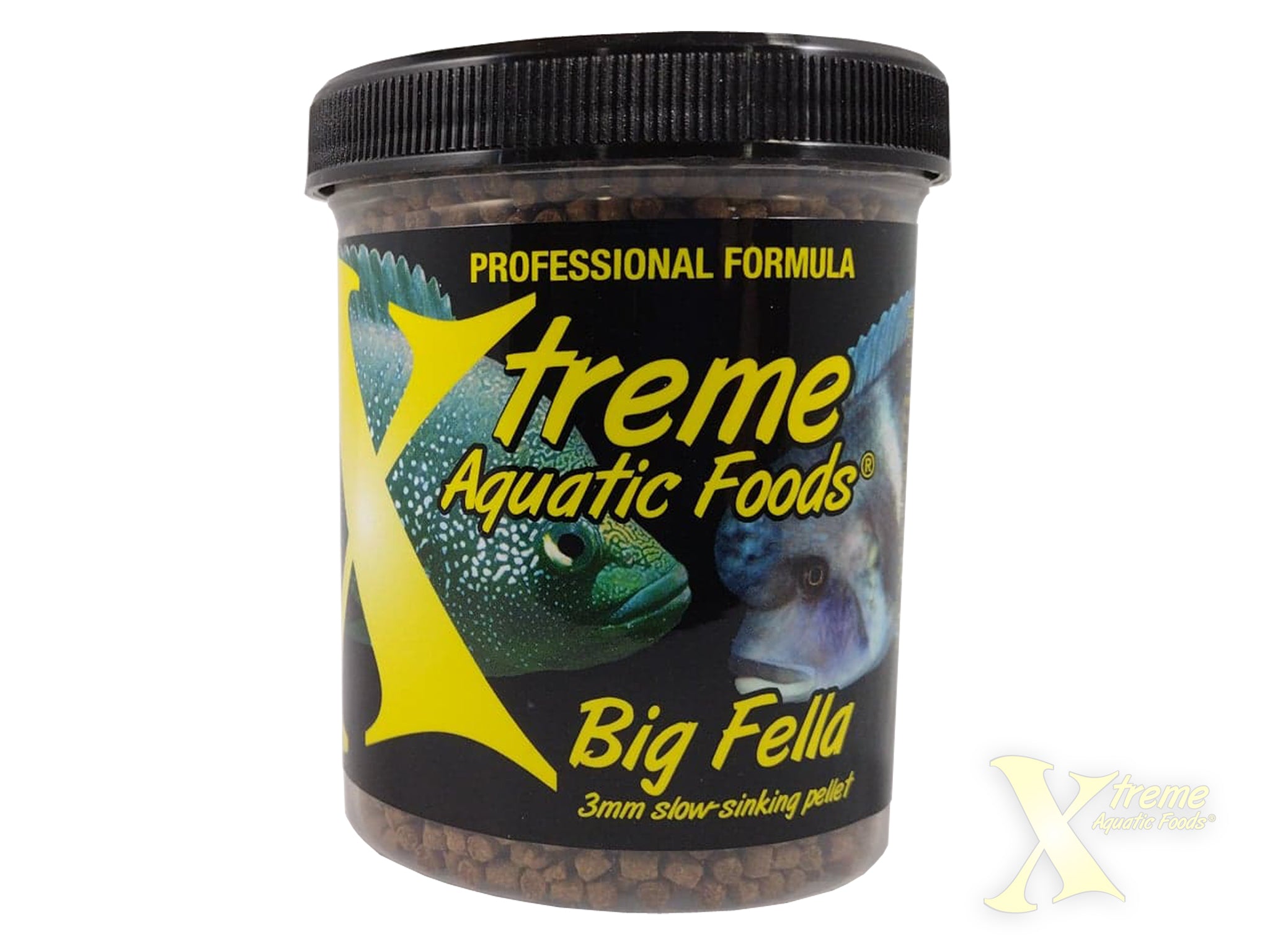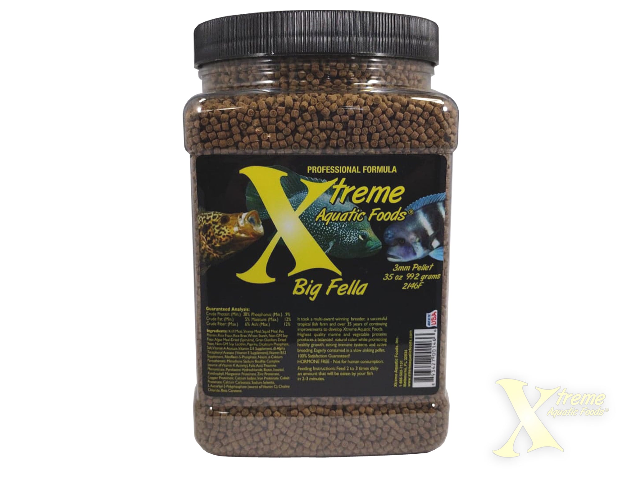 Description: Xtreme Big Fella Pellets are a great slow sinking 3mm pellet formulated for large cichlids, silver dollars, angels and other aggressive eaters. It contains a balanced blend of marine proteins and spirulina blue-green algae. No artificial color enhancers. This food will naturally enhance the coloration of your fish.  ...