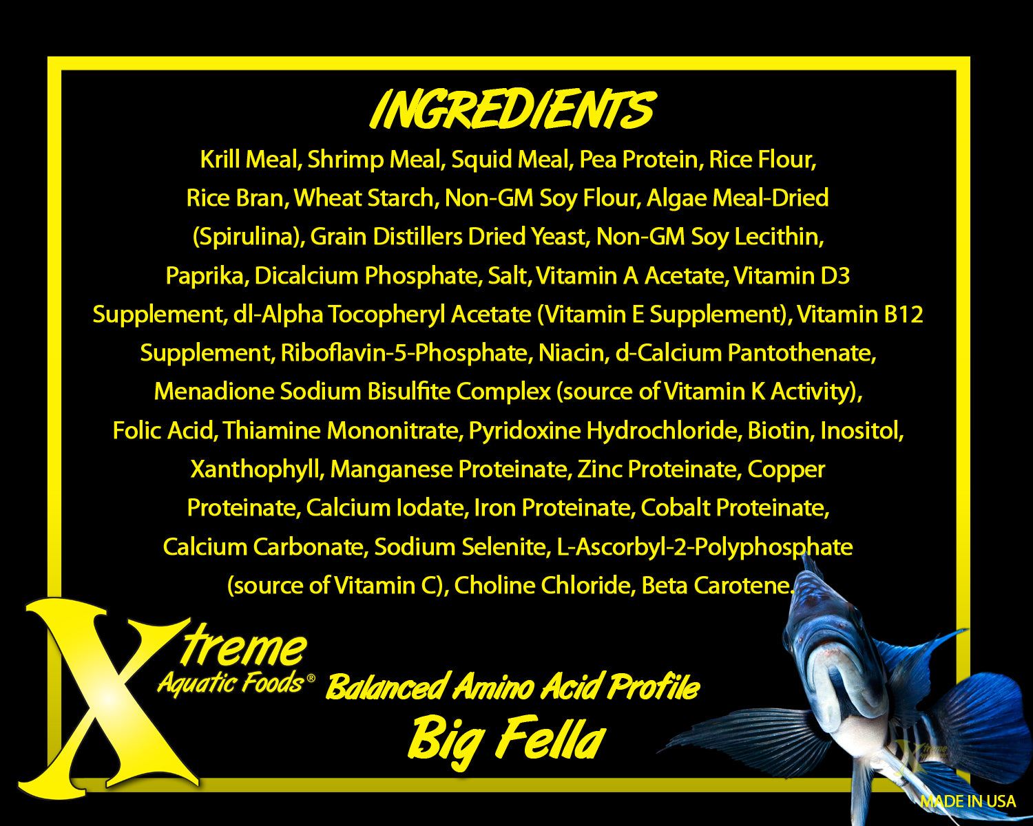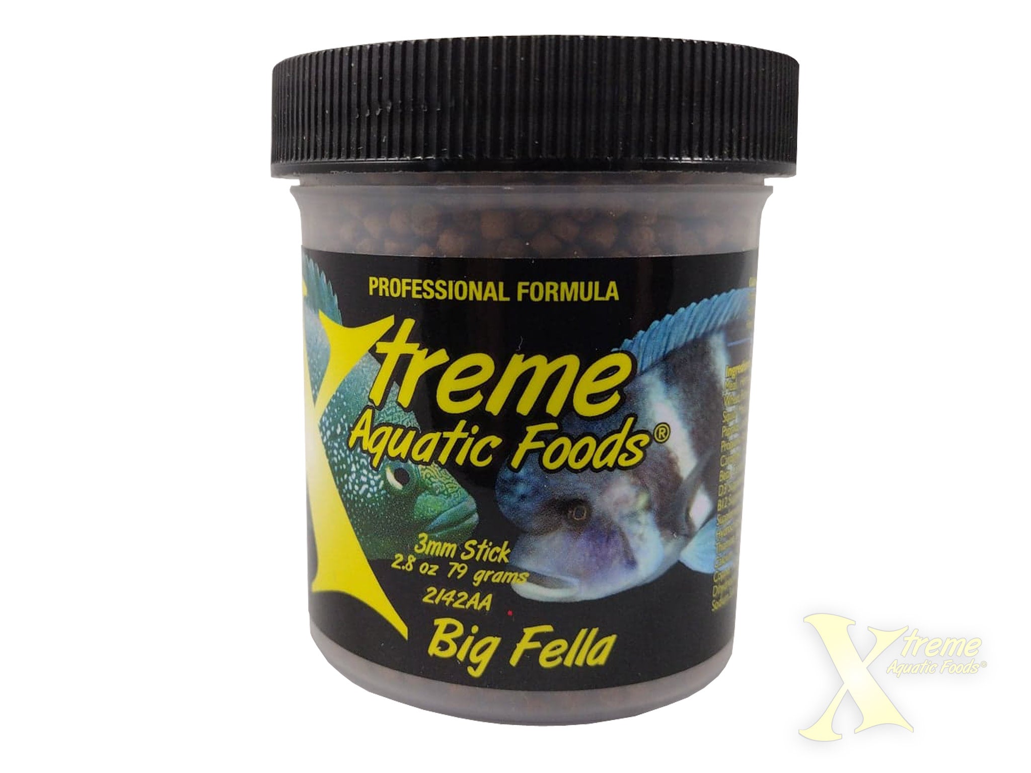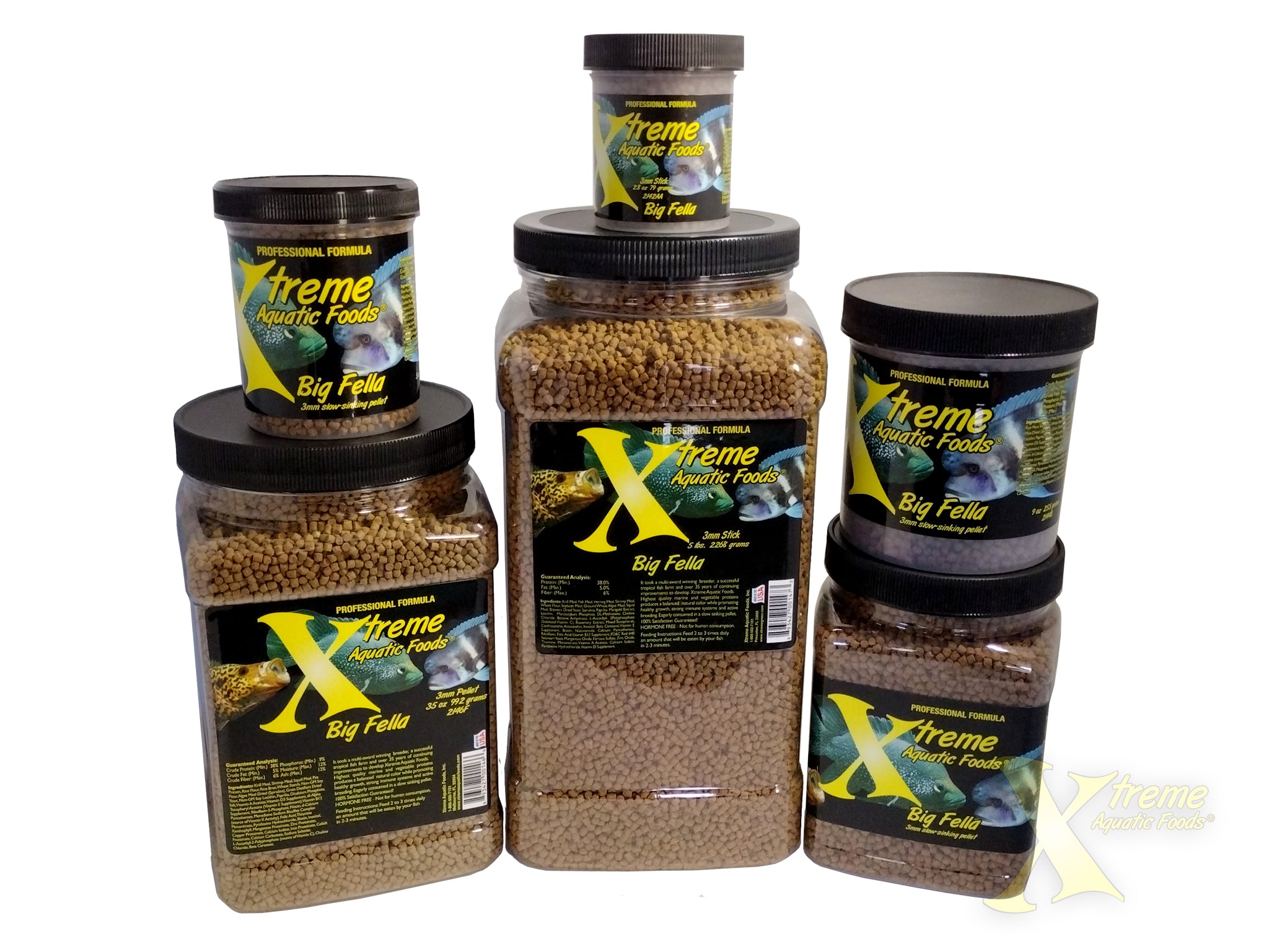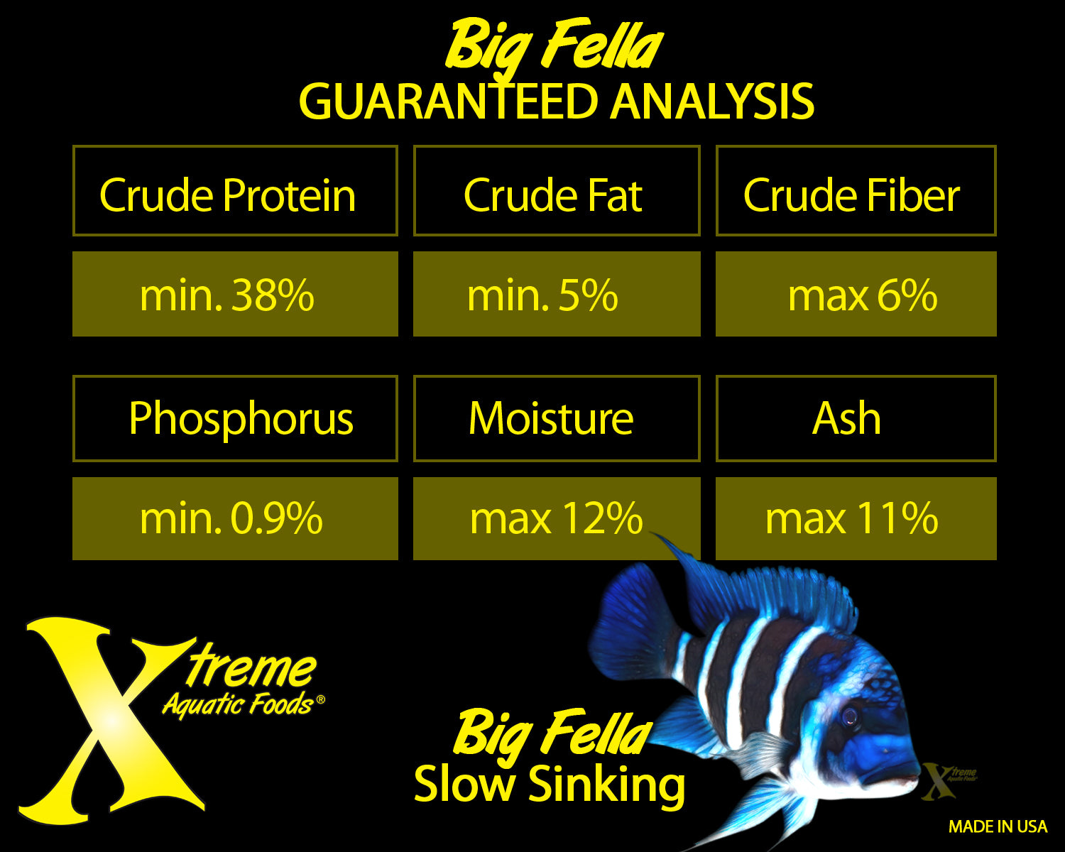 Description: Xtreme Big Fella Pellets are a great slow sinking 3mm pellet formulated for large cichlids, silver dollars, angels and other aggressive eaters. It contains a balanced blend of marine proteins and spirulina blue-green algae. No artificial color enhancers. This food will naturally enhance the coloration of your fish.  ...